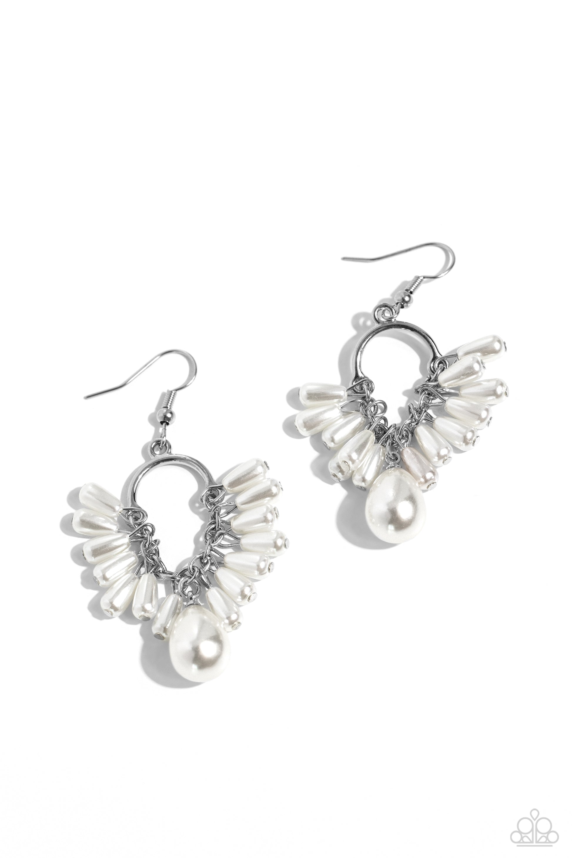 Dainty teardrop pearls fan out along a silver chain at the bottom of a curved silver bar, resulting in a whimsical fringe. An oversized teardrop pearl dances at the bottom of the display, adding an elegant twist to the modern inspired chandelier. Earring attaches to a standard fishhook fitting.