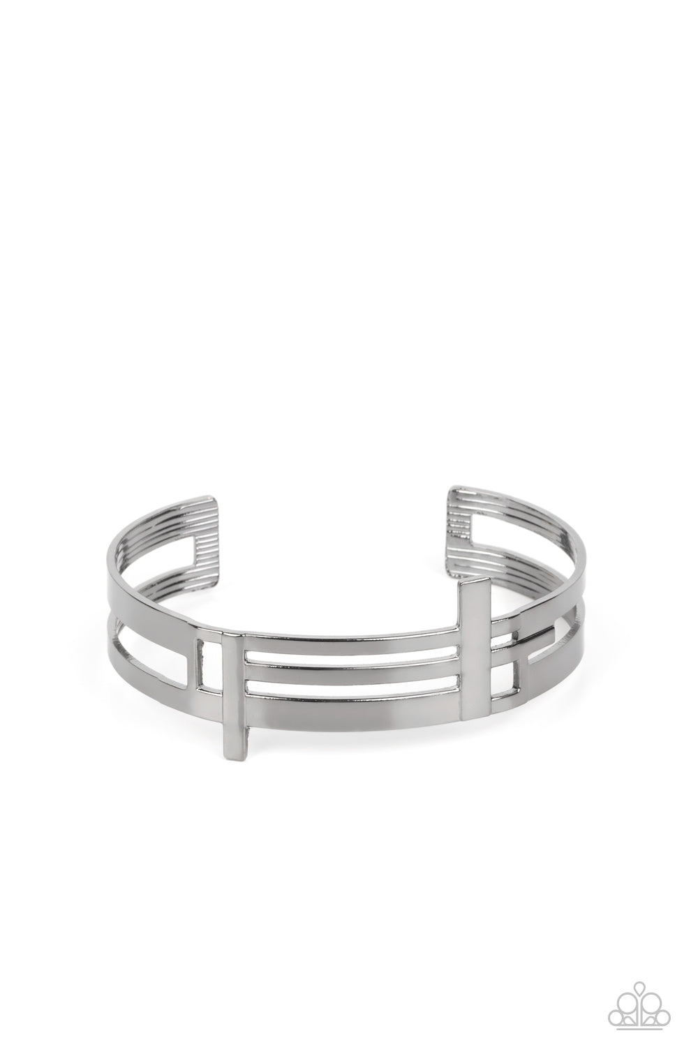 Two vertical cutouts run through a collection of lined abstract details on a bold airy gunmetal cuff that has been hammered with light-catching texture.