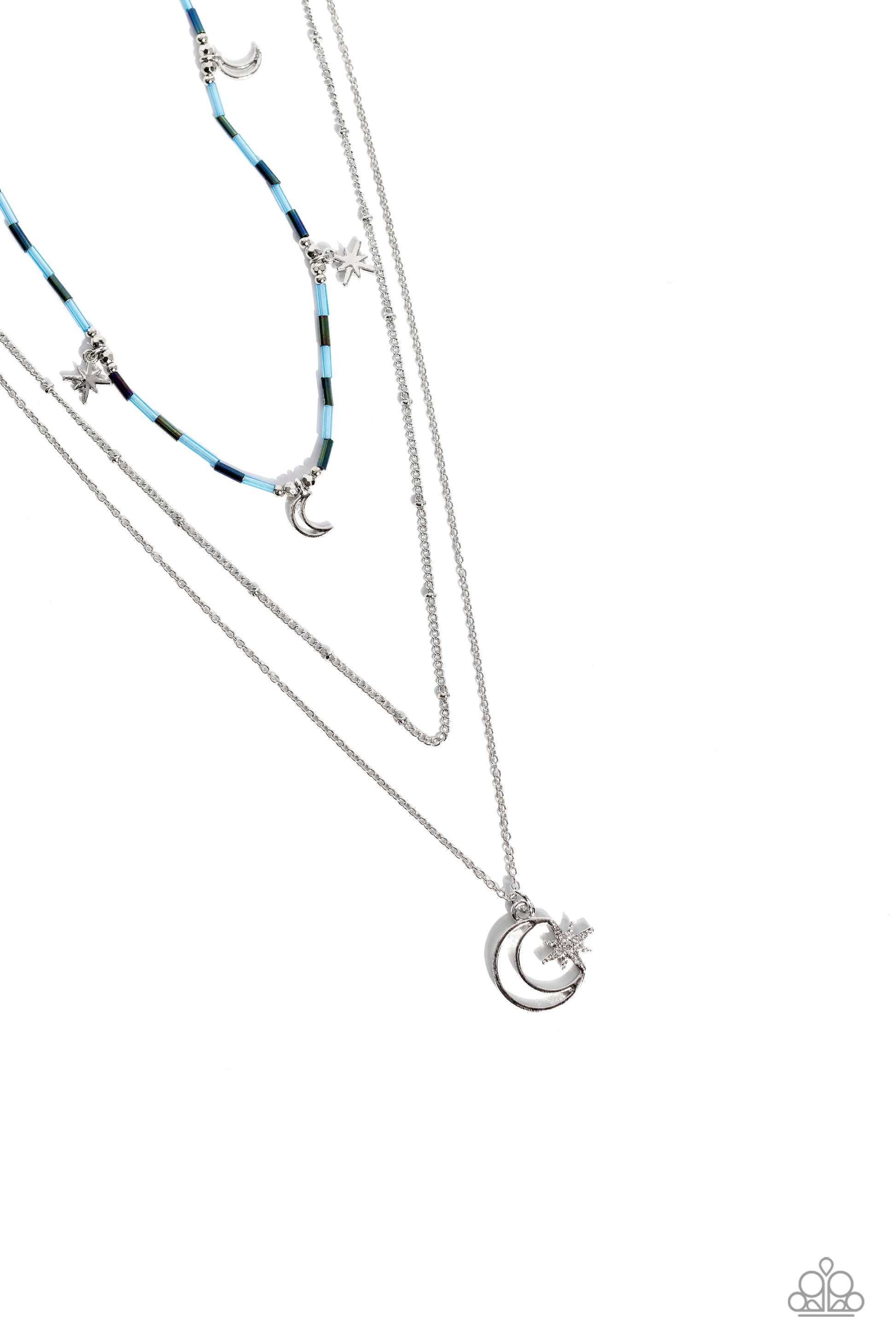 Three delicate chains cascade in various lengths across the chest, creating a radiantly layered display. Alternating between light blue and oil spill glass beads, a cosmic collection of silver stars and crescent moon charms sporadically dot the uppermost chain. The centermost chain is accented with dainty silver studs, while an oversized silver crescent moon embellished with a sparkling three-dimensional silver star creates a heavenly pendant at the bottom of the longest chain in a radiant finish. Features an adjustable clasp closure. Due to its prismatic palette, color may vary.