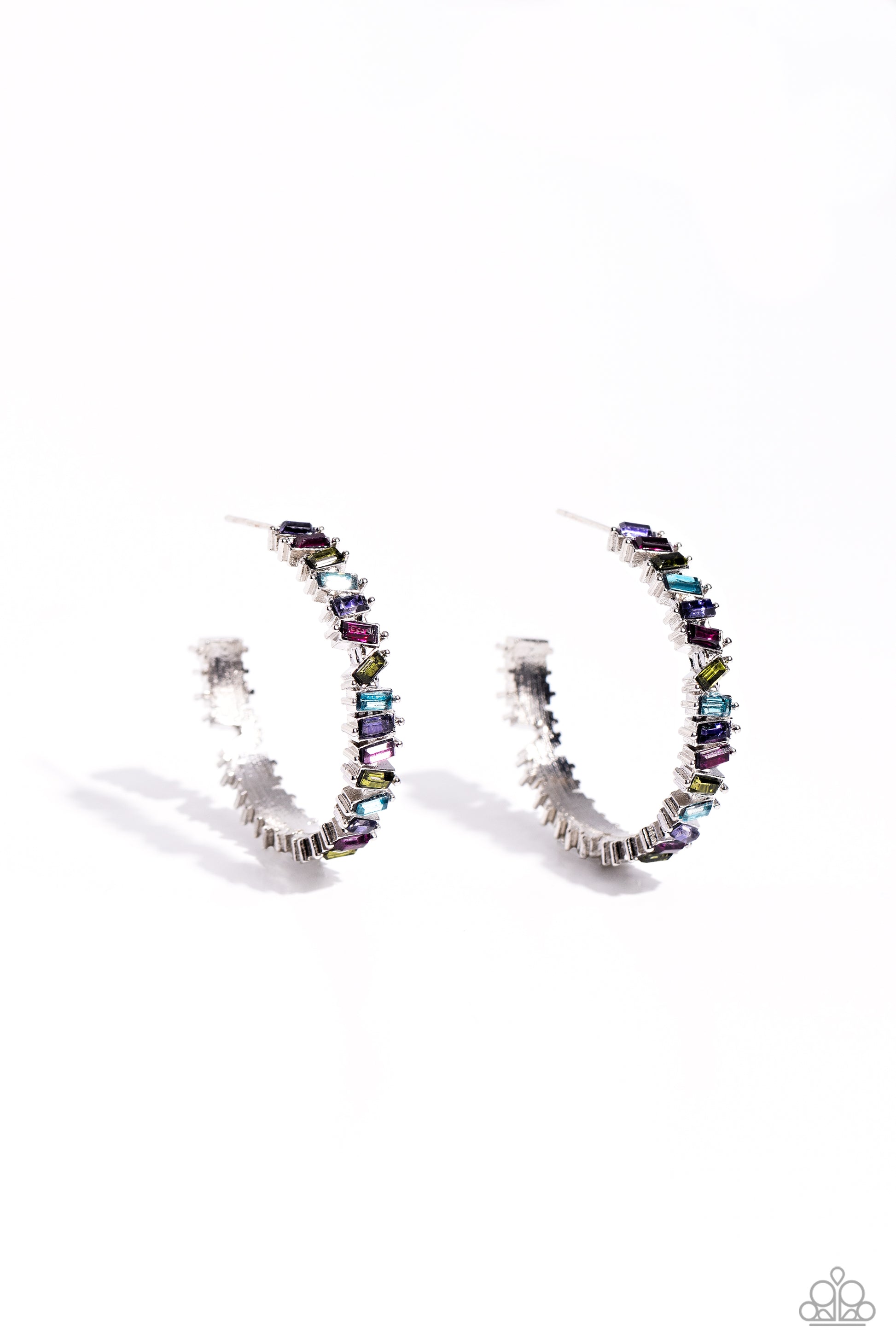Featuring various multicolored shades, emerald-cut gems set in silver-pronged fittings curve along the ear for a dizzying display. Earring attaches to a standard post fitting. Hoop measures approximately 1 1/2" in diameter.