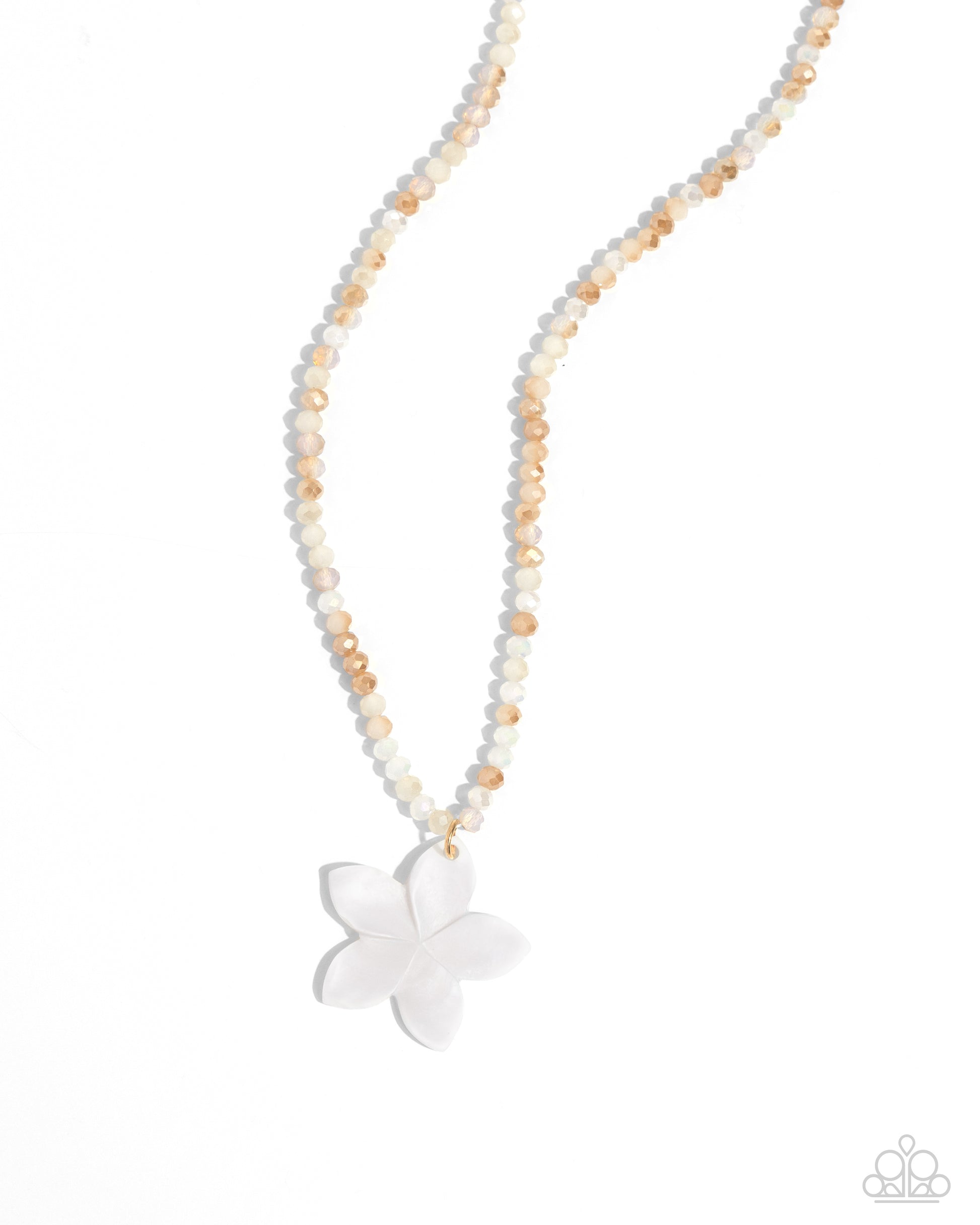 Infused along an invisible string, a collection of faceted white shimmery beads loop around the neckline. A white shell flower, resembling a Hawaiian flower glides along the beaded collection for a whimsical finish. Features an adjustable clasp closure.