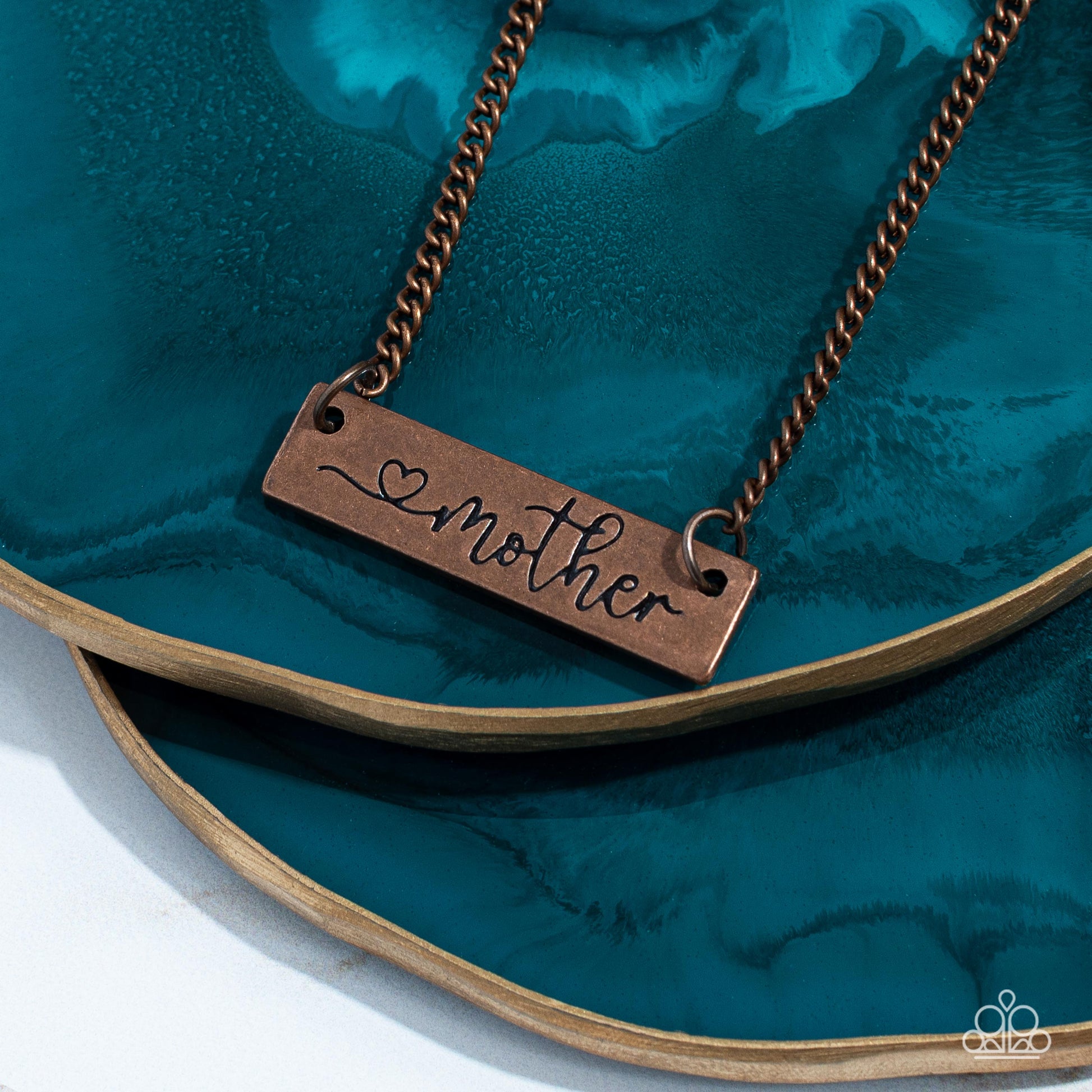 Stamped in a heart and the word, "Mother," an antiqued copper plate is suspended by a classic copper chain below the collar, creating a whimsy sentimental pendant. Features an adjustable clasp closure.