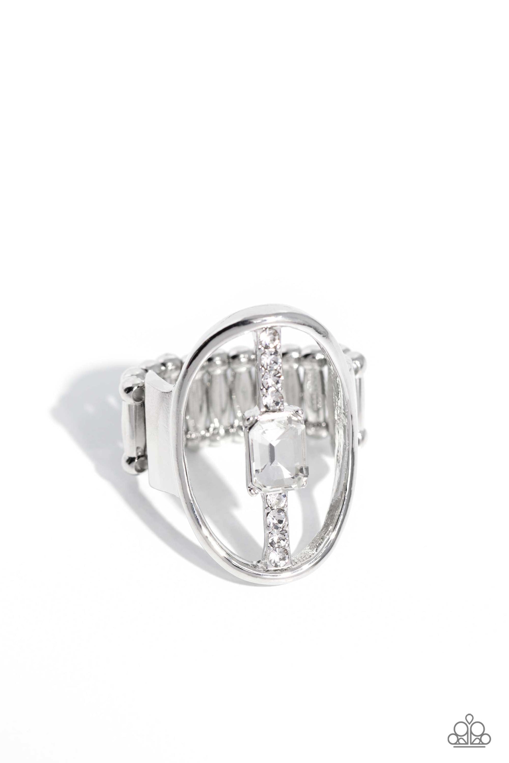 Infused on a dainty silver bar, a group of sparkling white rhinestones collect at the center of an airy silver oval centerpiece, coalescing into a refined frame. An emerald-cut white gem is pressed into the center of the rhinestone-dusted silver band for additional glitzy detail. Features a stretchy band for a flexible fit.