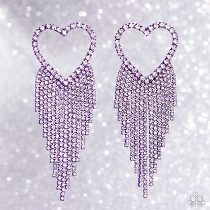 Encased in Heart shaped purple fittings. Strands of dainty, glistening, white gems cascade from base of heart frame.