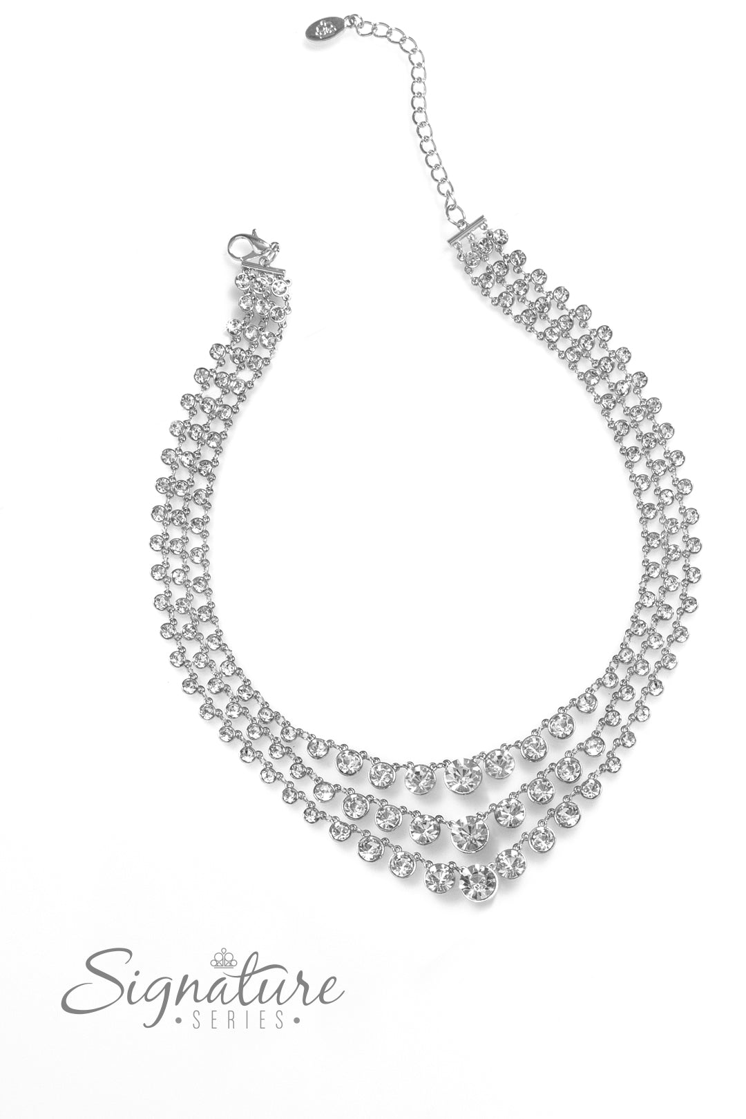 Rows of glittery, white rhinestones drape between two sleek silver bars, falling into three luxurious layers. The sparkling gems gradually increase in size as they fall toward the center of the design, adding dazzling dimension to the twinkling tiers. Features an adjustable clasp closure.